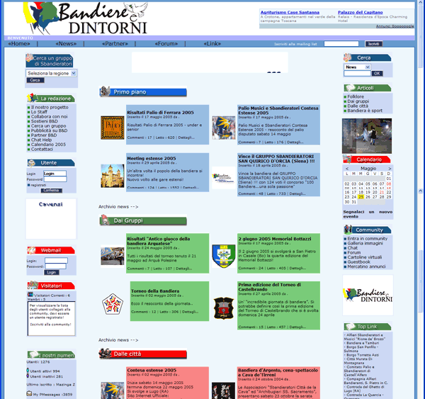 Strutturare per?, contenuti on line ? cosa ben diversa dal realizzare un giornale o costruire un format televisivo. E' diverso il mezzo, sono diverse le dinamiche di comunicazione, le aspettative dell'utenza e soprattutto gli obiettivi che ci si propone. Proprio per questo Bandiere e Dintorni.net diventa non solo punto d?informazione ma anche centro di aggregazione dove gli utenti sono partecipi ad ogni attivit? del giornale cos? da creare una vera e propria community di appassionati della bandiera e delle tradizioni della propria terra.