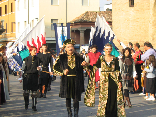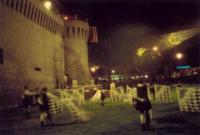 Le esibizioni di sbandieratori e tamburini, giocolieri, giullari e armati intrattengono il pubblico fino alla sera, fino al gran finale nel fossato della rocca: mangiafuoco e duelli di armati con spade infuocate introducono ?magia di ritmi e bandiere?, una spettacolare fusione di ritmi di tamburi e volteggiare di bandiere, tutto al lume delle torce e attorniati da effetti pirotecnici.