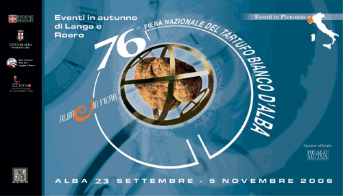 A tutti voi ? rivolto l?invito pi? caloroso nel venirci a trovare ad Alba; le manifestazioni si articoleranno dal 23 settembre al 5 novembre con la possibilit? di acquistare il Tartufo Bianco di Alba e di degustare i vini della zona. Da non dimenticare che domenica 12 novembre avverr? la VIII? Asta Mondiale del Tartufo; il ricavato sar? devoluto in beneficenza.